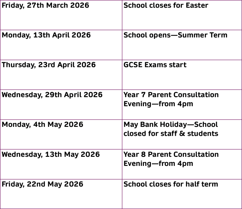 Coming up after the Easter break, we will be holding our Year 7 Parent Consultation Evening on Wednesday, 29th April, followed by Year 8 on Wednesday, 13th May. Please do everything you can to attend as it is very important that children see their parents/carers positively engaging with the school. Your support and encouragement play a vital role in helping your child achieve their best at school. School will be open to parents from 4pm to 6pm, and no appointment is needed.