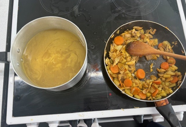 Week 3 – they roasted the carcass, then boiled the carcass with vegetables and spices to create a chicken stock. They used the stock to make a soup which they designed themselves. They also made accompaniments to go with the soup including fufu and croutons.